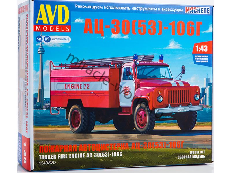 Сборная модель советской пожарной автоцистерны АЦ-30 (53)-106Г на базе Автомобиль (Г) тип 53 в масштабе 1/43 от фирмы AVD Models (артикул 1549).