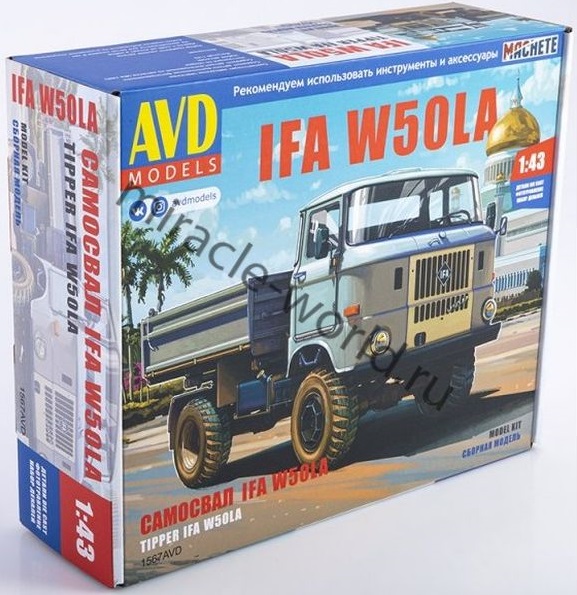 Сборная модель немецкого среднетоннажного грузового автомобиля, в версии самосвал IFA W50LA в масштабе 1/43 от фирмы AVD Models (артикул 1567).