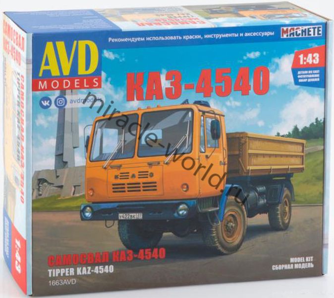 Сборная модель советского самосвала КАЗ-4540 "Колхида" в масштабе 1/43 от фирмы AVD Models (артикул 1663).