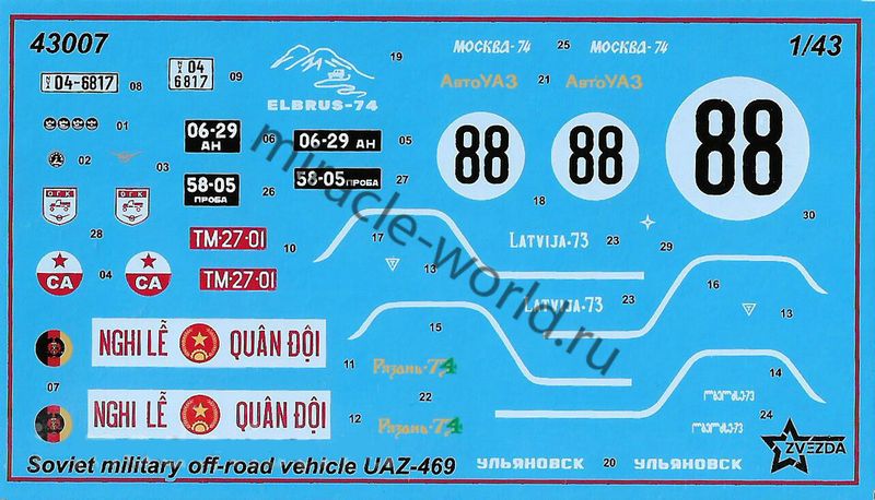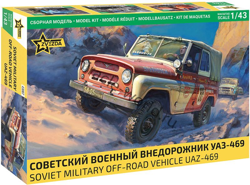 Сборная модель советского автомобиля повышенной проходимости УАЗ-469 (военный внедорожник) в масштабе 1/43 от фирмы Звезда / Zvezda (артикул 43007).
