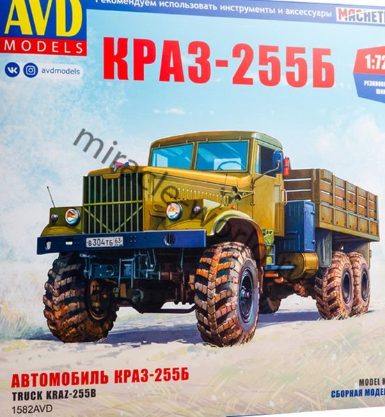 Сборная модель советского крупнотоннажного грузового автомобиля-вездехода с колесной формулой 6×6 КрАЗ-255Б в масштабе 1/72 от фирмы AVD Models (артикул 1582).