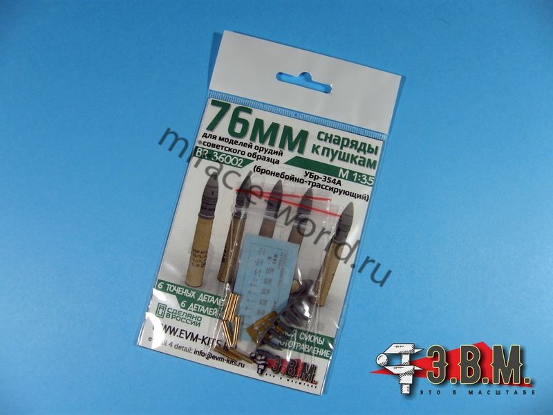 "Бронебойный снаряд УБР-354А 76мм" Предназначены для пушек ЗиС-3/САУ Су-76; Орудий КВ-1/Танк 34 (пушка Ф-34) В комплекте 6 точеных гильз, плата фототравления с донцами гильз, декаль (имеет возможность удаления лаковой подложки), а так же сами снаряды изготовленные посредством 3D печати. Масштаб 1:35 арт. BR36002