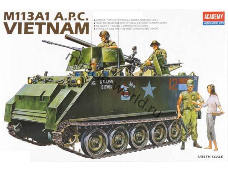Сборная модель американского бронетранспортера M113A1 (Вьетнам, 4 варианта: RAA, M132A1, R.O.K., M113A1 ACAV) с интерьером в масштабе 1/35 от фирмы Academy (артикул 13266).