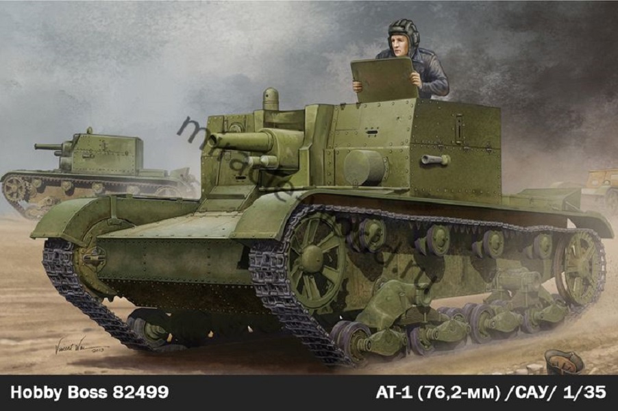 Сборная модель советской самоходной артиллерийской установки АТ-1 на базе Танк тип 26 в масштабе 1/35 от фирмы Hobby Boss (артикул 82499).