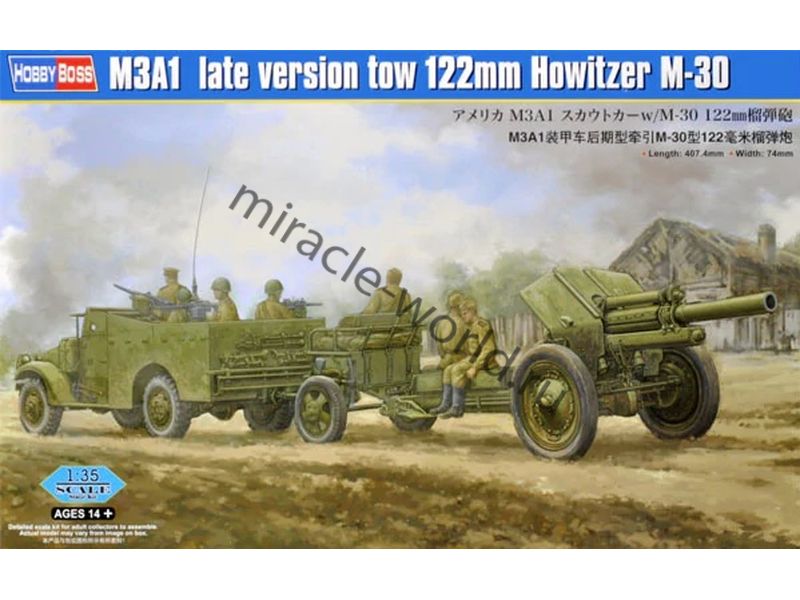 Сборная модель американского легкого разведывательного бронеавтомобиля в советской эксплуатации M3A1 Scout Car (late) c 120-мм гаубицей М-30 в масштабе 1/35 от фирмы Hobby Boss (артикул 84537).