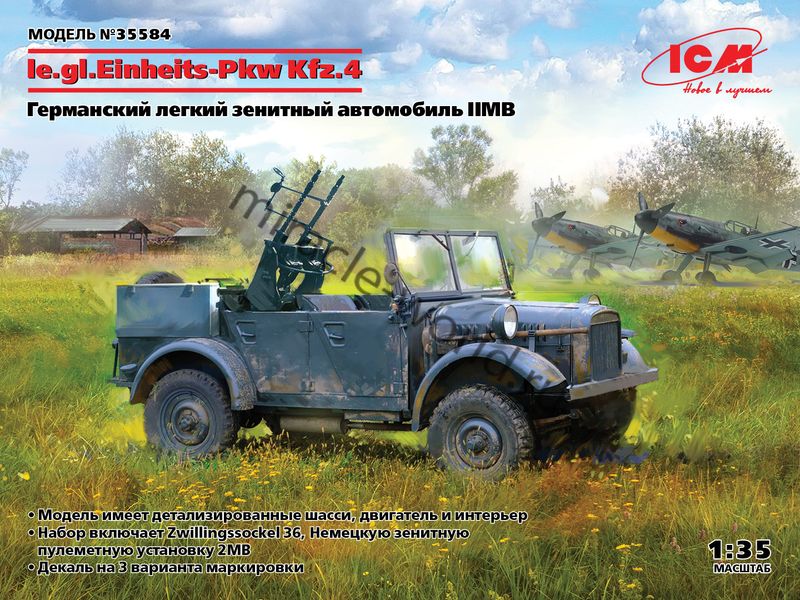 Сборная модель немецкого легкого зенитного автомобиля le.gl.Einheits-Pkw Kfz.4 с ЗУ Zwillingssockel 36 в масштабе 1/35 от фирмы ICM (артикул 35584).