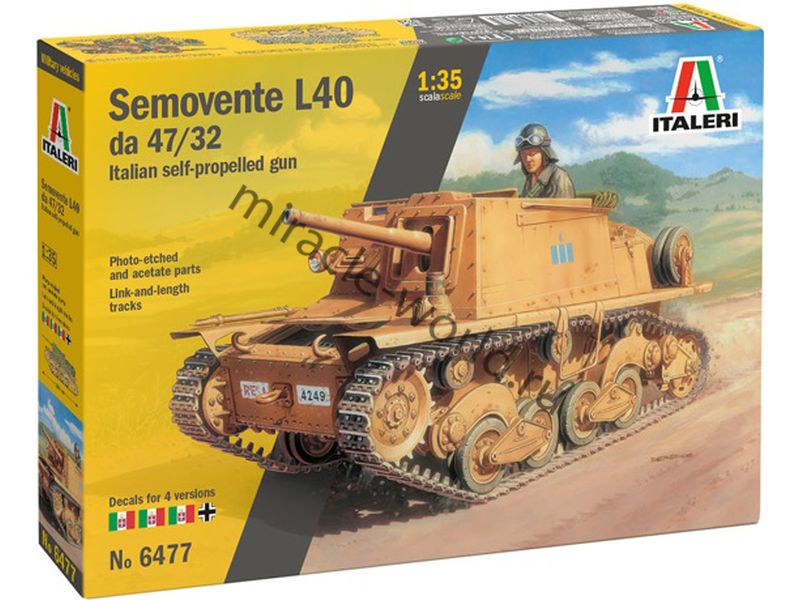 Сборная модель итальянской самоходной артиллерийской установки Semovente L.40 da 47/32 в масштабе 1/35 от фирмы Italeri (артикул 6477).