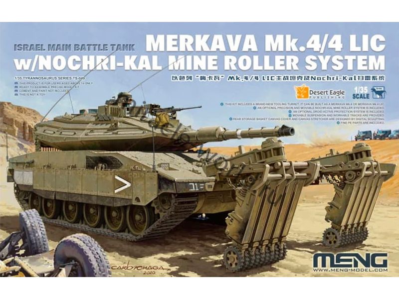 Сборная модель израильского основного боевого танка Merkava Mk.IV / Mk.IV LIC w/Nochri-Kal Mine Roller System в масштабе 1/35 от фирмы Meng Model (артикул TS-049).