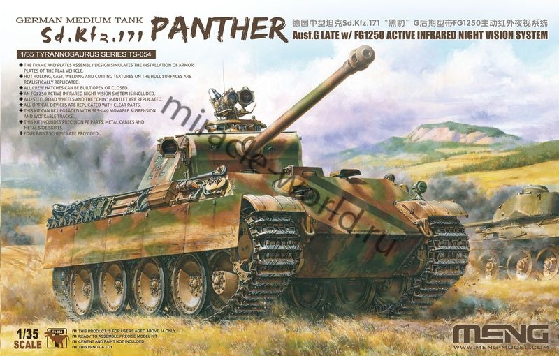 Сборная модель немецкого среднего танка Sd.Kfz.171 Pz.Kpfw.V Ausf.G "Panther" (late) w/FG1250 в масштабе 1/35 от фирмы Meng Model (артикул TS-054).