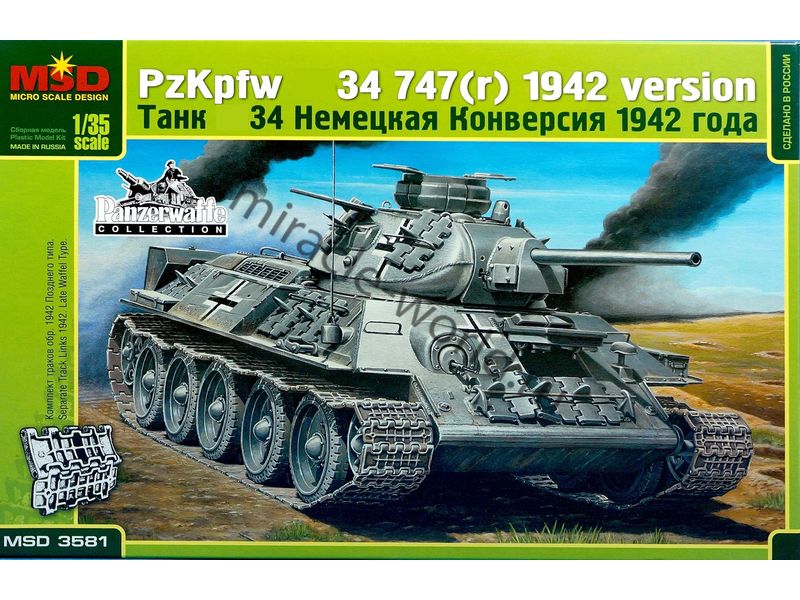 Сборная модель трофейного среднего танка в немецкой эксплуатации Pz.Kpfw. 34 747(r) / Танк тип 34/76 (образца 1942г.) в масштабе 1/35 от фирмы MSD / Maquette (артикул 3581).