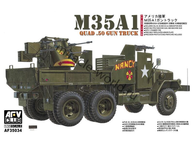 Сборная модель американского военного автомобиля в варианте типа "ган-трак" M35A1 Quad .50 Gun Truck в масштабе 1/35 от фирмы AFV Club (артикул AF35034).