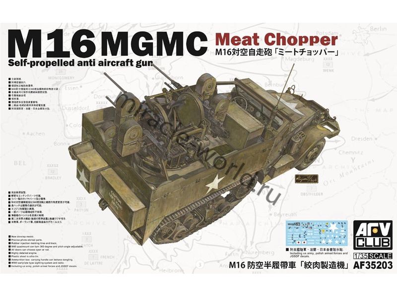 Сборная модель американского полугусеничного БТР, в варианте зенитной самоходной установки M16 MGMC с зенитной установкой M45 Quadmount в масштабе 1/35 от фирмы AFV Club (артикул AF35203).