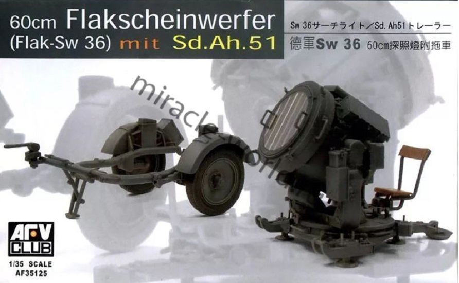 Сборная модель немецкого прожектора с прицепом-тележкой SW-36 Serchlight with Sd.Ah.51 Trailer в масштабе 1/35 от фирмы AFV Club (артикул AF35125).