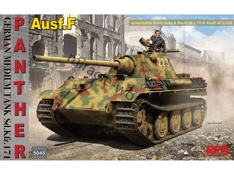 Сборная модель немецкого среднего танка Sd.Kfz.171 Pz.Kpfw.V Ausf.F "Panther" w/ KwK 42 L/75 & L/100 в масштабе 1/35 от фирмы Rye Field Model (артикул RM-5045).