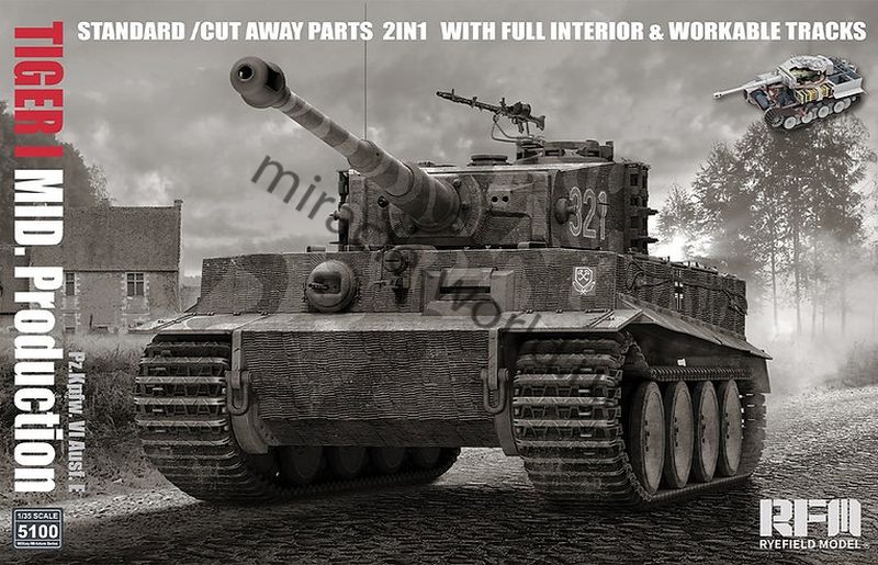 Сборная модель немецкого тяжелого танка Sd.Kfz.181 Pz.Kpfw.VI "Tiger I" (middle) с интерьером и рабочими траками в масштабе 1/35 от фирмы Rye Field Model (артикул RM-5100).