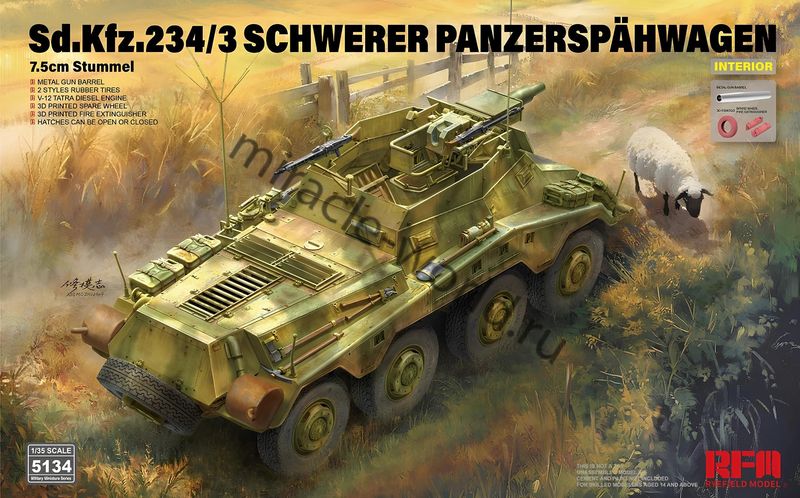 Сборная модель немецкого тяжелого бронеавтомобиля Sd.Kfz.234/3 Schwerer Panzerspähwagen (75-мм KwK 51) в масштабе 1/35 от фирмы Rye Field Model (артикул RM-5134).