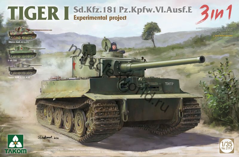 Сборная модель трофейного немецкого тяжелого танка в советской эксплуатации Sd.Kfz.181 Pz.Kpfw.VI Ausf.E "Tiger I" Sd.Kfz.181 Pz.Kpfw.VI Ausf.E 3in1 Experimental project (3 варианта орудия) в масштабе 1/35 от фирмы Takom (артикул 2192).