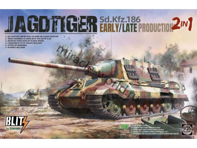 Сборная модель немецкой противотанковой самоходной артиллерийской установки Sd.Kfz.186 "Jagdtiger" (early/late) в масштабе 1/35 от фирмы Takom (артикул 8001).