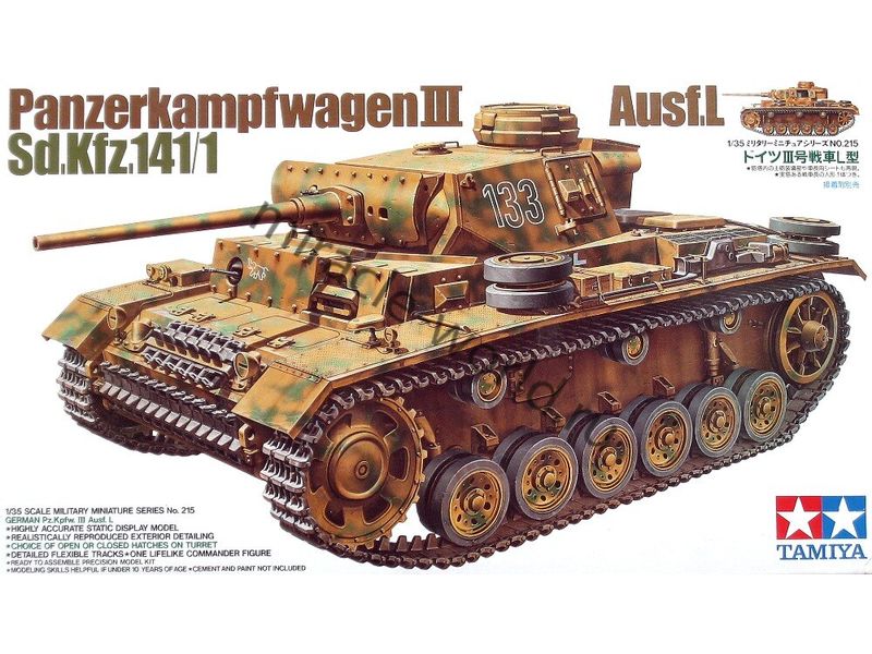 Сборная модель немецкого среднего танка Sd.Kfz.141 Pz.Kpfw.III Ausf.L (50-мм L/60) с танкистом в масштабе 1/35 от фирмы Tamiya (артикул 35215).