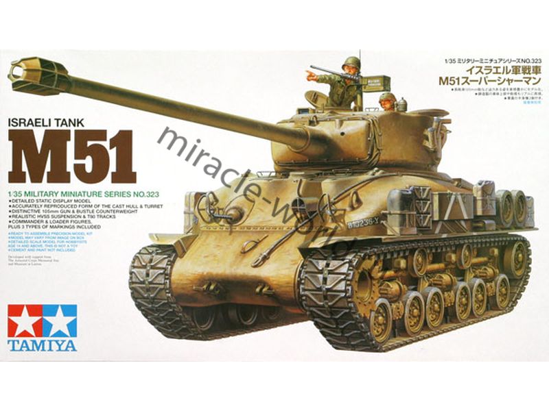 Сборная модель израильской модификации американского среднего танка M-51 "Super Sherman" / M51HV с танкистами в масштабе 1/35 от фирмы Tamiya (артикул 35323).
