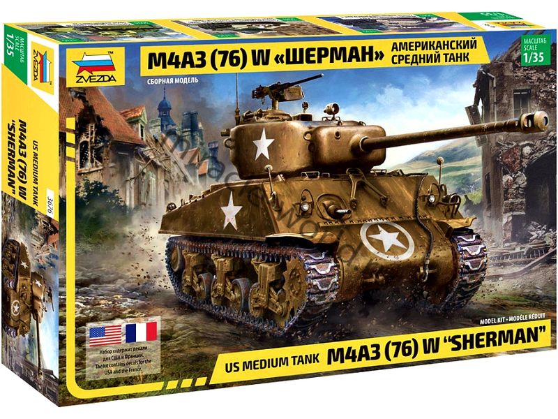 Сборная модель американского среднего танка M4A3(76)W "Sherman" в масштабе 1/35 от фирмы Звезда / Zvezda (артикул 3676).