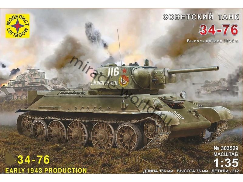 Сборная модель советского среднего танка Танк тип 34/76 выпуск начала 1943г. в масштабе 1/35 от фирмы Моделист (артикул 303529).