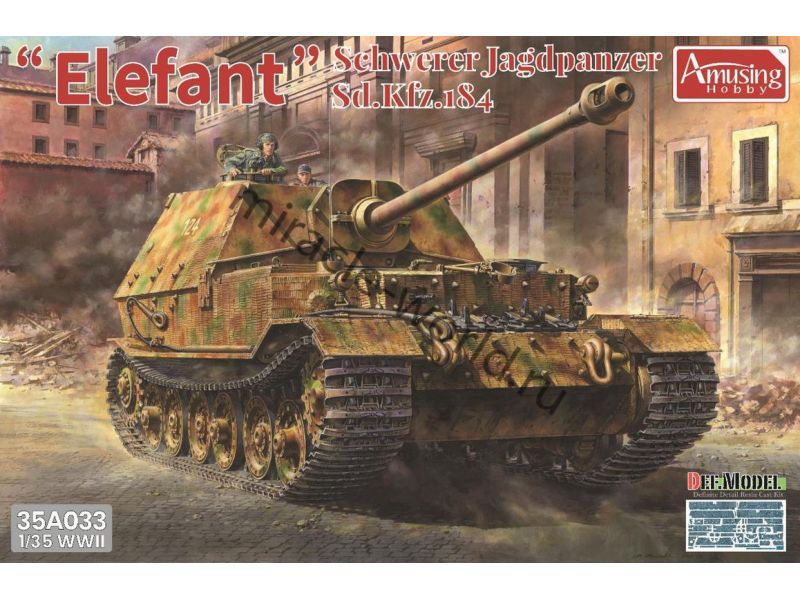 Сборная модель немецкой самоходной артиллерийской установки Sd.Kfz.184 "Elefant" с циммеритом и интерьером в масштабе 1/35 от фирмы Amusing Hobby (артикул 35A033).