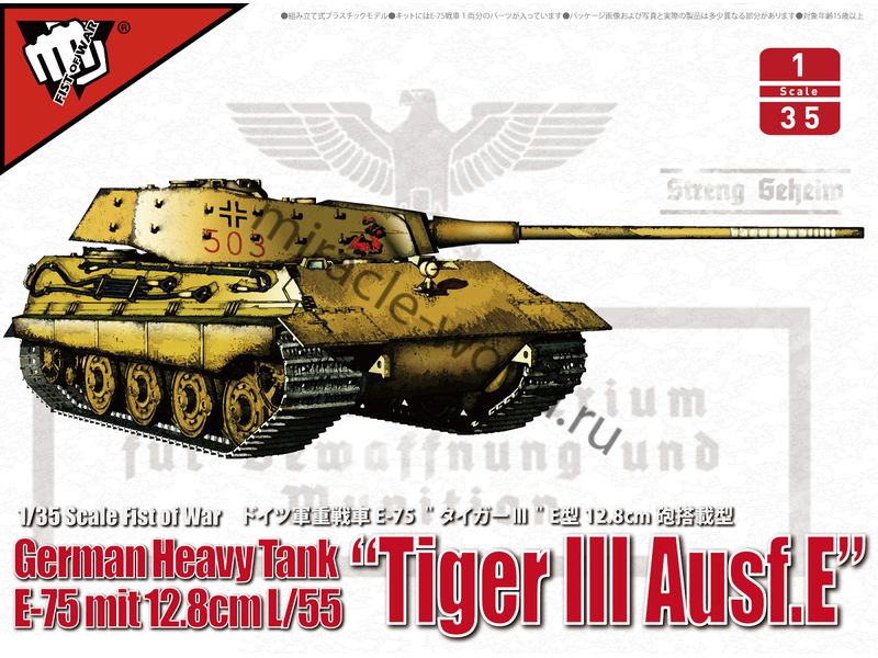 Сборная модель немецкого тяжелого танка E-75 w/12.8cm L/55 "Tiger III Ausf.E" в масштабе 1/35 от фирмы Modelcollect (артикул UA35016).