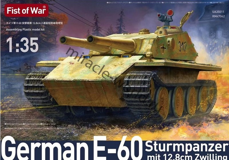 Сборная модель немецкого среднего танка с сдвоенным орудием E-60 “Sturmpanzer” mit 12.8cm Zwilling в масштабе 1/35 от фирмы Modelcollect (артикул UA35011).