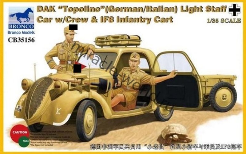 Сборная модель итальянского легкового автомобиля на службе Вермахта Fiat 500 "Topolino" с экипажем (Вермахт) и прицепом IF8 в масштабе 1/35 от фирмы Bronco Models (артикул CB35156).