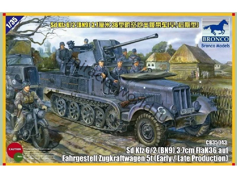 Сборная модель немецкой самоходной зенитной установки Sd.Kfz.6/2 с Flak 36 (37-мм) auf Fahrgestell Zugkkraftwagen 5t (early/late) в масштабе 1/35 от фирмы Bronco Models (артикул CB35043).
