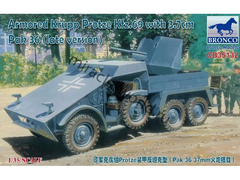 Сборная модель немецкого тяжелого бронеавтомобиля с орудием 3.7 PaK 35/36 auf Leichter Gelandegangige Lastkraftwagen 1t на базе Krupp L2H143 в масштабе 1/35 от фирмы Bronco Models (артикул CB35132).