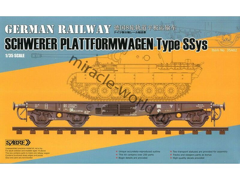 Сборная модель немецкой тяжелой железнодорожной платформы Schwerer Plattformwagen Type SSys в масштабе 1/35 от фирмы Sabre (артикул 35A02).
