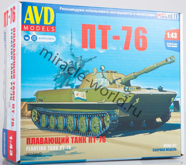 Сборная модель советского легкого плавающего танка ПТ-76 в масштабе 1/43 от фирмы AVD Models (артикул 3015).