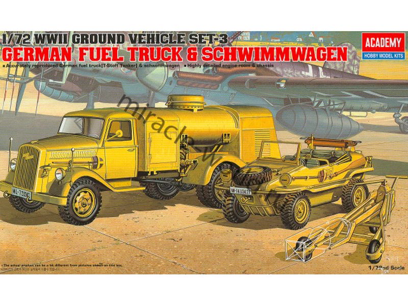 Набор сборных моделей немецкой техники Kfz.385 на базе Opel Blitz, Kfz.1 Volkswagen Type 166 "Schwimmwagen" и водило в масштабе 1/72 от фирмы Academy (артикул 13401).