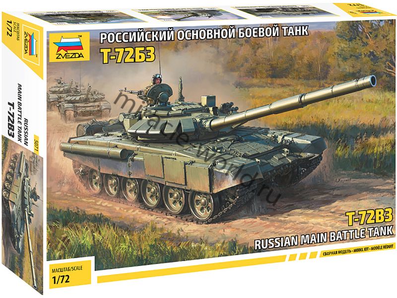 Сборная модель российского основного боевого танка Т-72Б3 в масштабе 1/72 от фирмы Звезда / Zvezda (артикул 5071).