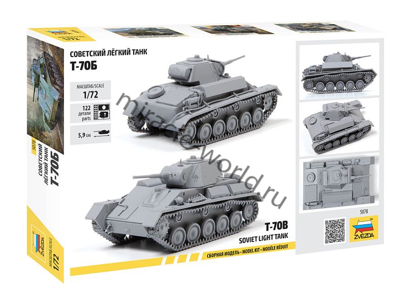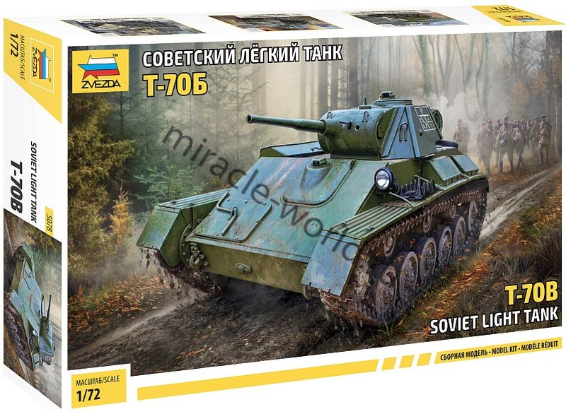 Сборная модель советского легкого танка Т-70Б в масштабе 1/72 от фирмы Звезда / Zvezda (артикул 5078).