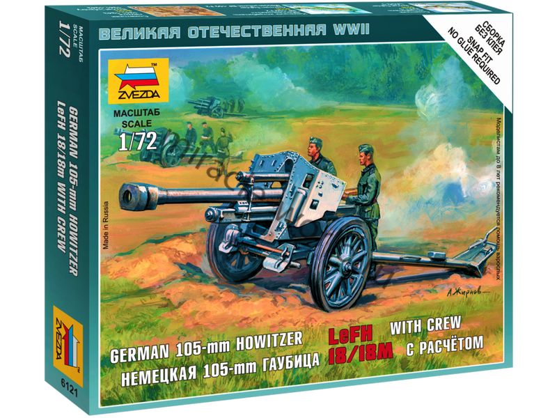 Сборная модель немецкой легкой полевой гаубицы leFH 18/18M (105-мм) с расчетом в масштабе 1/72 от фирмы Звезда / Zvezda (артикул 6121).