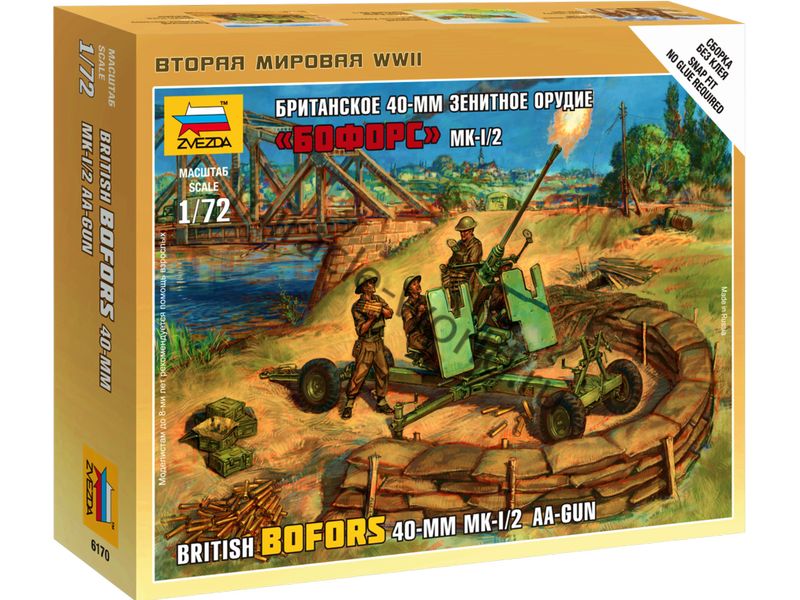 Сборная модель британского зенитного орудия Bofors Mk.I/2 (40-мм) с расчетом в масштабе 1/72 от фирмы Звезда / Zvezda (артикул 6170).