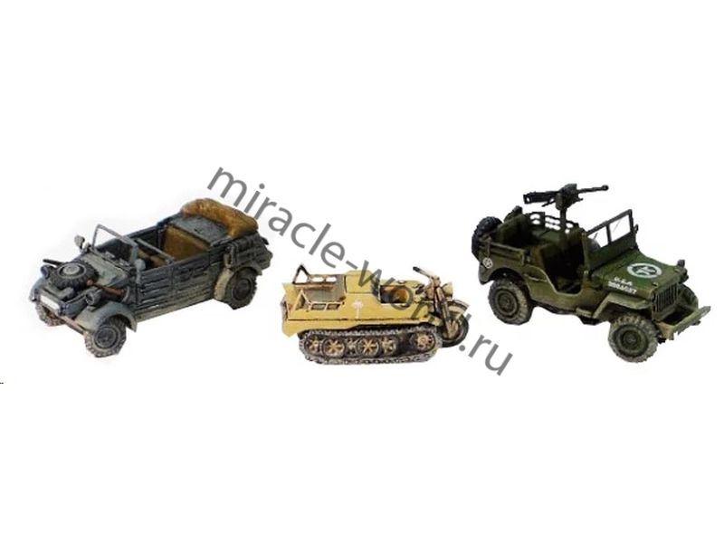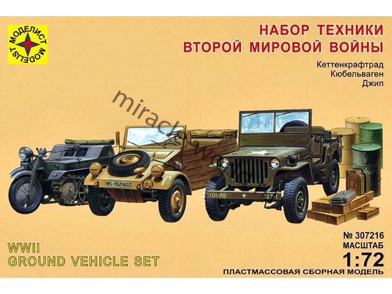 Сборная модель техники второй мировой войны Kettenkrad, VW Тур 82 Kubelwagen, Willys MB в масштабе 1/72 от фирмы Моделист (артикул 307216).