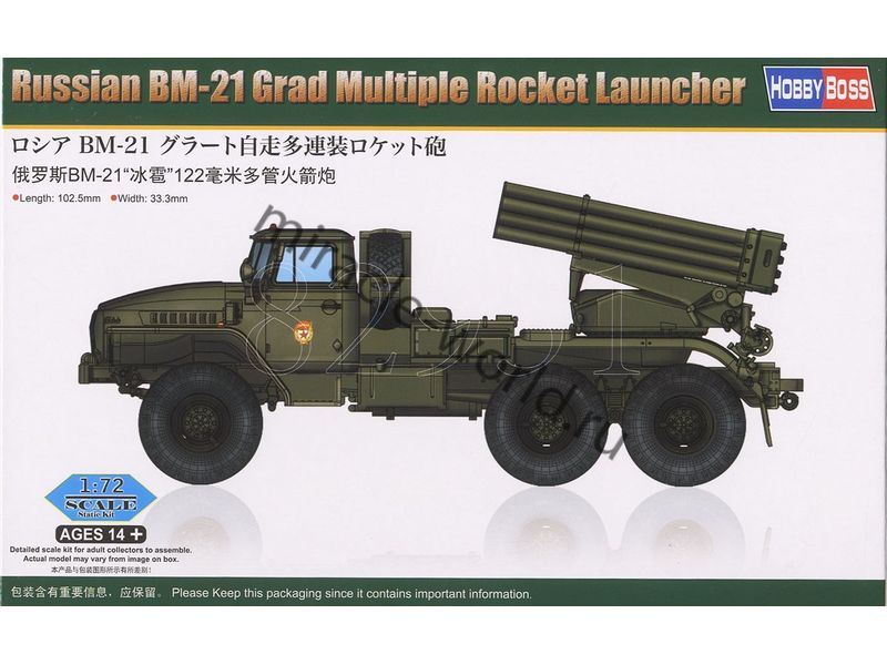 Сборная модель советской / российской реактивной системы залпового огня БМ-21 / 9К51 "Град" (122-мм) на базе Автомобиль (У) тип 4320 в масштабе 1/72 от фирмы Hobby Boss (артикул 82931).