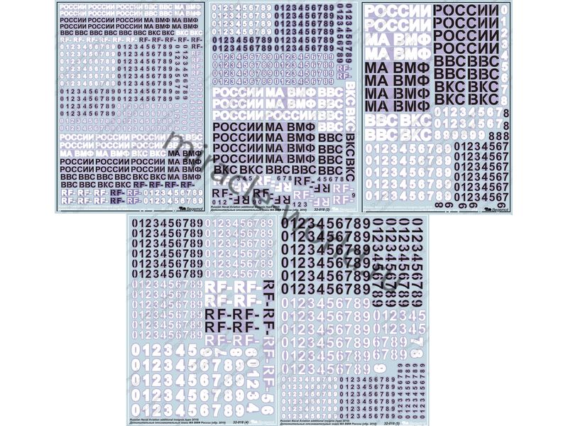 Дополнительные опознавательные знаки ВВС России (образца 2010 года), а именно надписи ВВС РОССИИ, МА ВМФ РОССИИ и ВКС РОССИИ и наборные регистрационные коды шести различных размеров и исполнений.
