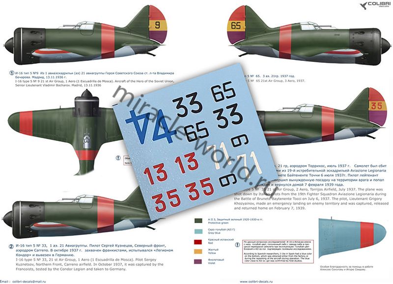 Colibri Decals 48048 Декаль: И-16 тип 5. Часть 1 "Испания" /6 вариантов маркировки/ 1/48