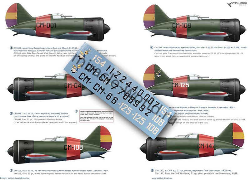 Colibri Decals 48049 Декаль: И-16 тип 5. Часть 2 "Испания" /8 вариантов маркировки/ 1/48