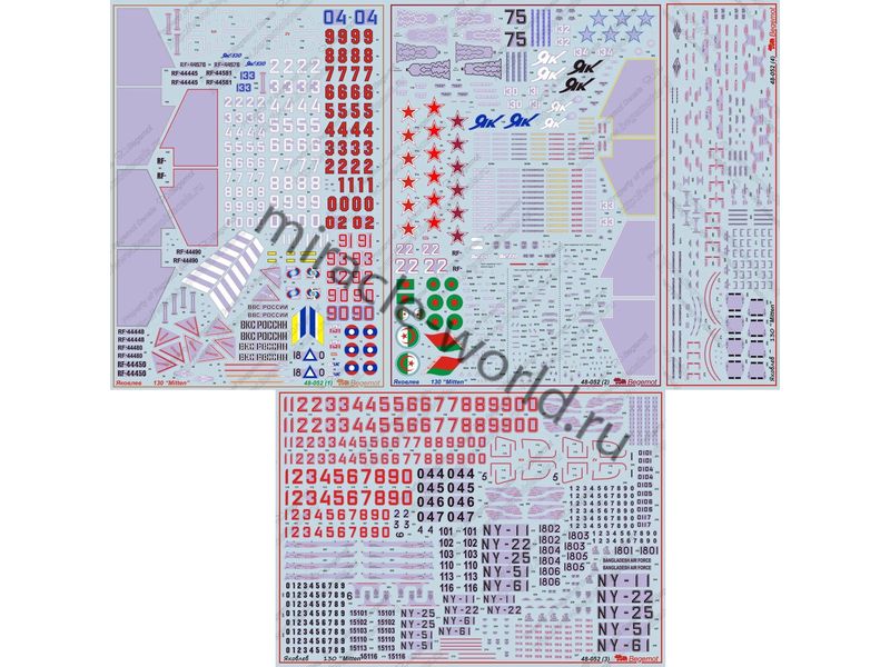 Деколь на все известные на сейчас самолеты Як-130 из состава ВВС России, Беларуси, Алжира, Мьянмы, Лаоса и Бангладеш. Полный комплект технических надписей на самолет и подвесное вооружение. В комплект входит три листа декали большого размера и один лист деколи маленького размера и инструкция на 10-х страницах формата А3.