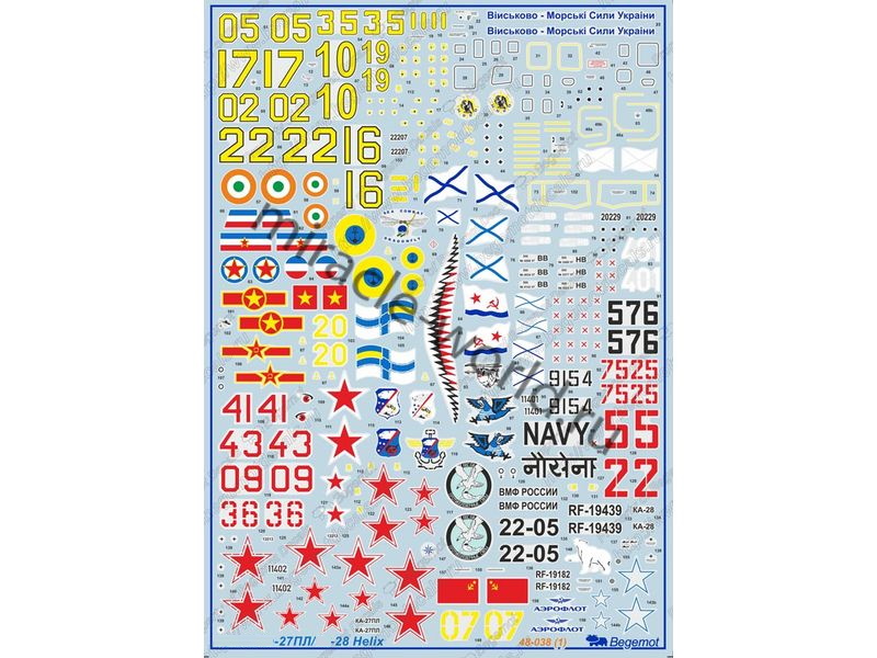 Begemot 48-038 Декаль: Вертолет (К) тип 27ПЛ / Вертолет (М) тип 28 /20 вариантов + техничка/ 1/48