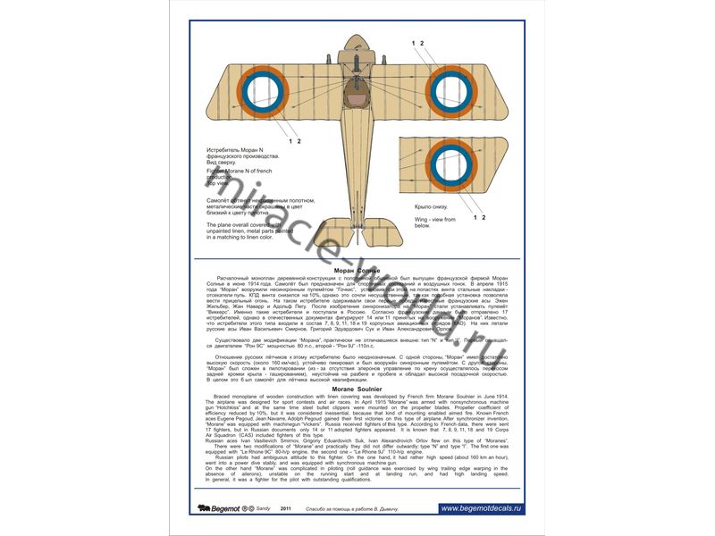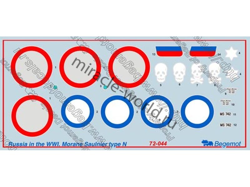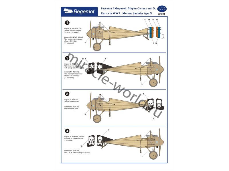 Begemot 72-044 Декаль: Morane-Saulnier Type N Россия в I мировой войне /4 варианта маркировки/ 1/72