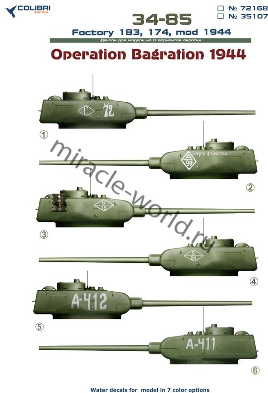 Colibri Decals 35107 Декаль: Танк тип 34/85 "Операция Багратион" Завод № 183/147 1/35
