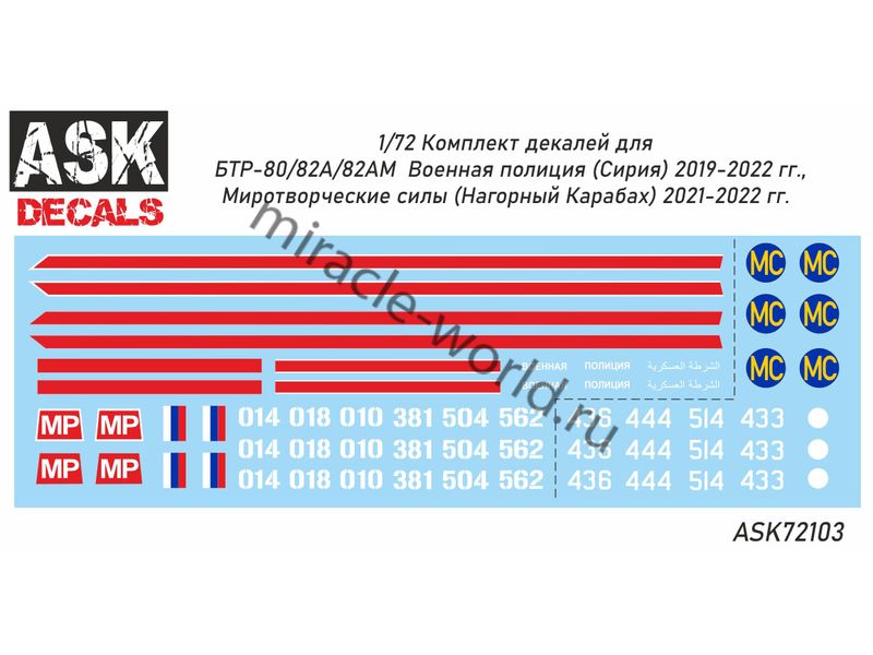 ASK 72103 Декаль: БТР-80/БТР-82 Военная полиция (Сирия)/ Миротворческие силы (Нагорный Карабах) 1/72