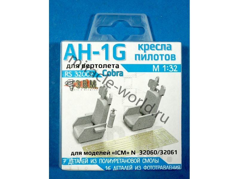 RS32002 Кресла пилотов вертолета AH-1G "Cobra" (ICM). Масштаб 1/32. Набор включает семь деталей из полиуретановой смолы и 17 деталей из фототравления. Предназначен для модели компании ICM арт. 32060 и 32061.